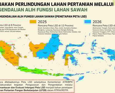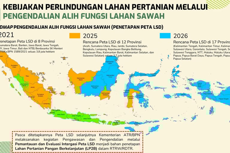 Melalui kebijakan ini, pemerintah menetapkan peta khusus yang menunjukkan lokasi sawah yang harus dilindungi agar tetap menjadi lahan pertanian.